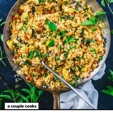 Got Thai basil? Here’s a great way to use it: Thai Basil Fried Rice! We have an abundant Thai basil plant in our garden, along with our Italian sweet basil. It’s got purple stems and a delicate black licorice flavor that’s absolutely irresistible. Add it to fried rice, and it infuses an irresistible aroma that makes it impossible not to take another bite. It’s a great way to use this herb if you have it on hand! We could not stop sneaking bites of this one.