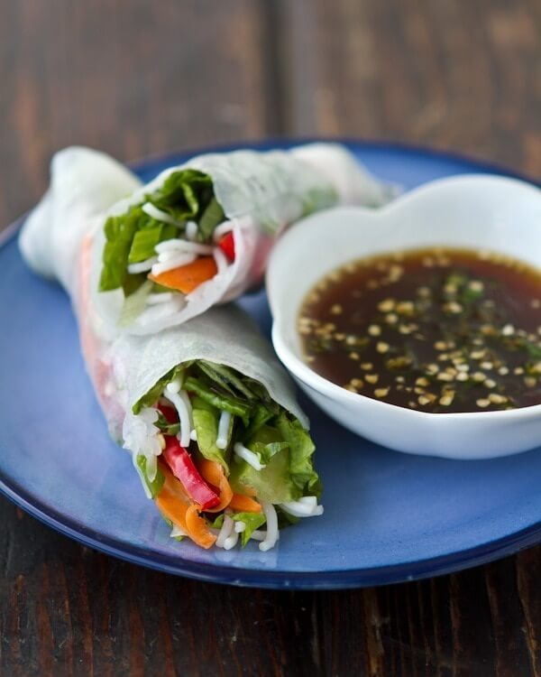 These fresh vegetable spring rolls are packed with Thai basil, carrots, lettuce, green onion, and more! The Thai basil makes the dish, with its anise essence.