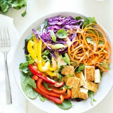 A fast and easy dinner recipe, this colorful Thai salad recipe features a flavorful peanut sauce dressing. It’s vegan, gluten-free, and delicious!