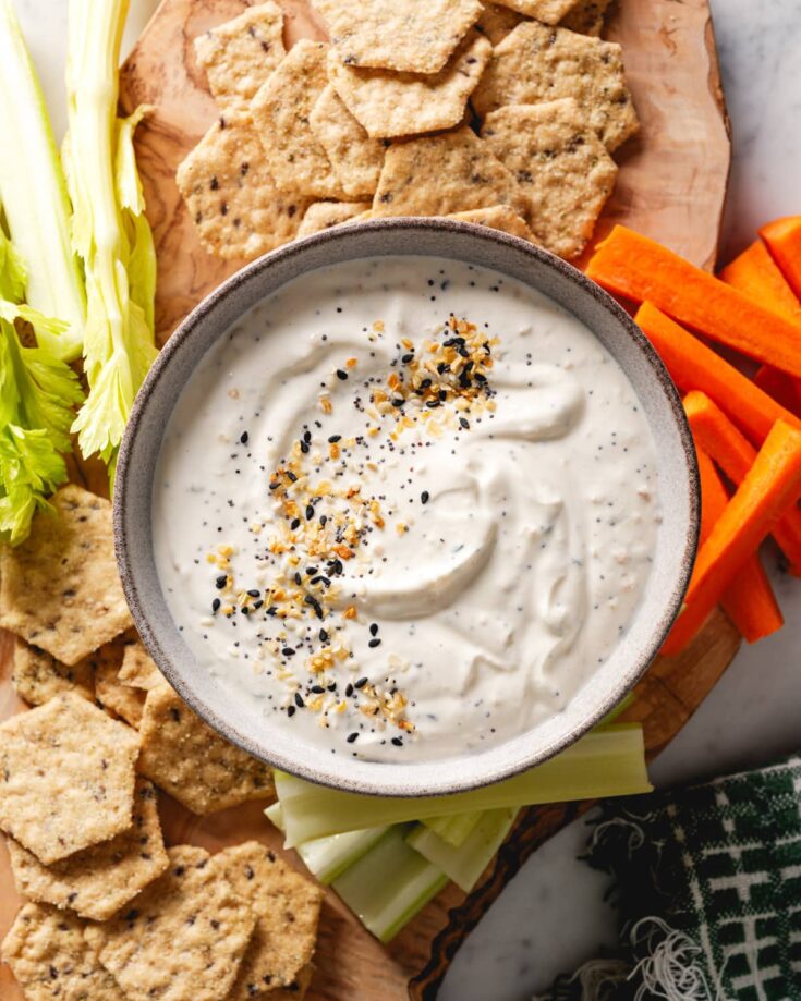 This Everything Bagel dip made with Greek yogurt is perfect for parties and entertaining or simple snacking! Everyone loves this easy appetizer recipe and it takes only 5 minutes to mix up. I make it often and it's perfect for holidays where you don't want to stress about buying too many ingredients.