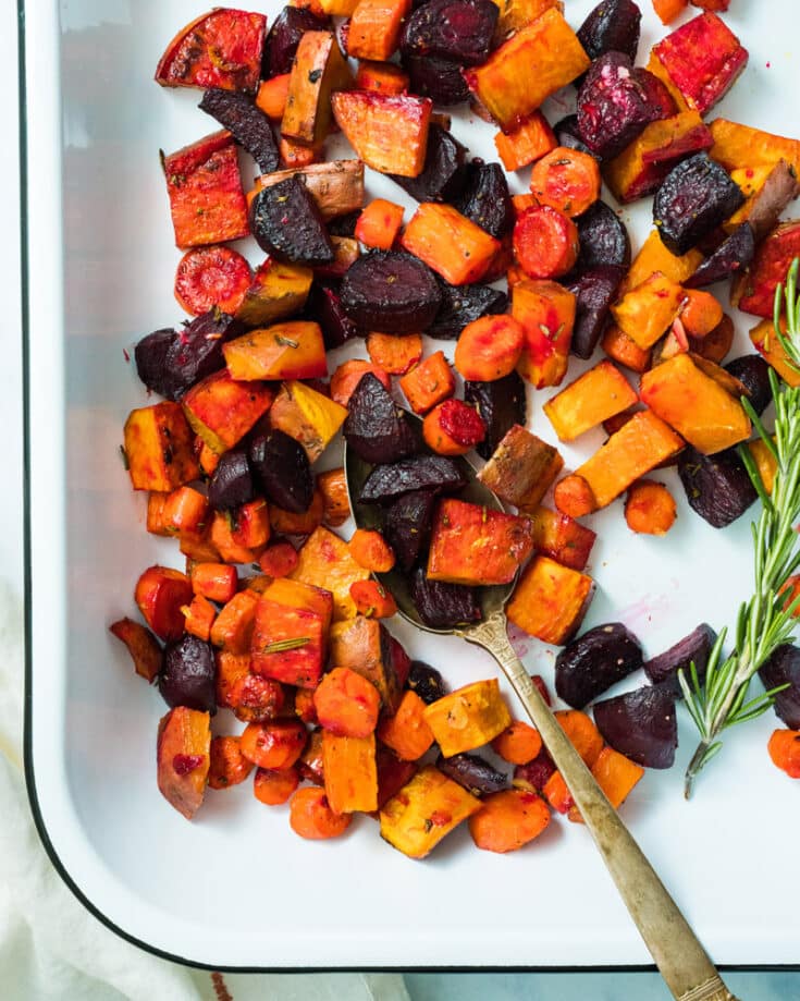 Instead of covering root vegetables in marshmallows and maple syrup: why not simply roast them in a hot oven until tender and sweet? This recipe features a combination of sweet potatoes and carrots, roasted with garlic and fresh rosemary.