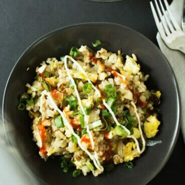 Looking for a fun homemade fried rice recipe? This easy fried rice is maximum comfort food, with three types of onions and a sriracha and mayo drizzle!