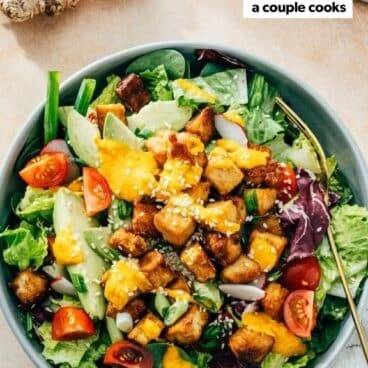 *For a more protein-packed salad or for feeding very hungry eaters, use 1 recipe of baked tofu for 2 salads instead. (Our Baked Tofu disappears very quickly!) Make the baked tofu before serving, or make it in advance. It’s absolutely worth the 45 minutes! To make it in advance, store refrigerated up to 3 days. Then warm it in a 350 degree oven before serving to crisp up the edges. As a shortcut, try a purchased seasoned tofu: we like Hodo brand tofu cubes that you can warm in a skillet for a few minutes.