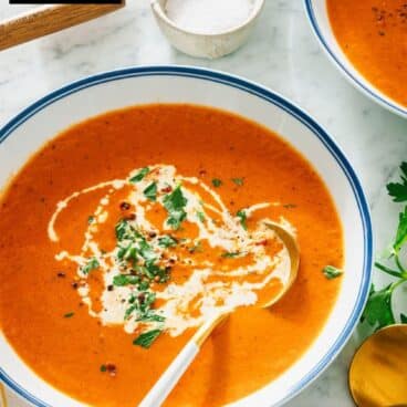 Here’s a cozy, creamy soup that works in nearly any season: try Tomato Bisque! This vibrant puree melds bright tomatoes, garlic and aromatic vegetables with a touch of cream for a rich, silky body. It’s pure and simple, perfect with a hunk of crusty no knead bread or a grilled cheese sandwich. Here’s how to make a simple tomato bisque!