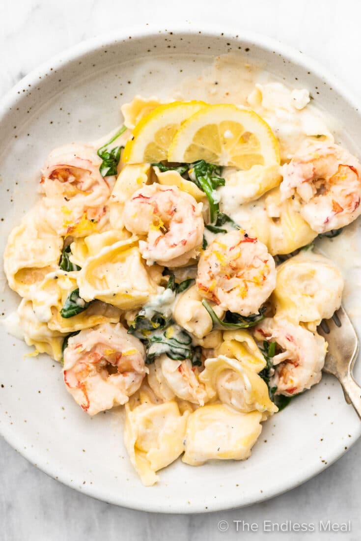 Shrimp tortellini is a total treat: and a quick and easy dinner! It features tender shrimp, an insanely delicious creamy lemon garlic sauce, and cheese tortellini. Bonus that you can whip up this tasty dinner in just 15-minutes! via The Endless Meal