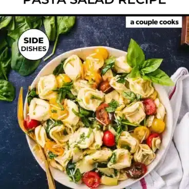 Here’s a pasta salad recipe that’s ultra versatile for picnics, barbecues, and an easy lunch idea: this Tortellini Salad! The tang of the artichoke, chewy pillowy pasta, zippy tomatoes, and peppery basil come together into a symphony of flavor! Even better, it stores up to 4 days in the fridge, making it a perfect easy lunch. We’ve made this more times than we can count already: and it’s irresistibly delicious every time.