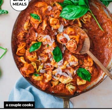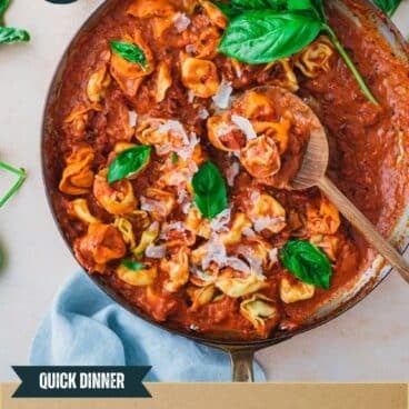 This tortelloni pasta could not be tastier paired with tomato cream sauce! The rich, tangy sauce pairs perfectly with the pillowy filled pasta—made in just 30 minutes.