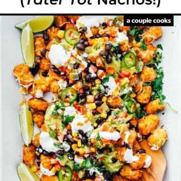 This totchos recipe is my favorite way to make them, topped with black beans, corn, pico, guacamole, sour cream, and lots of cheese. Here are my tricks to making your own pan of tater tot nachos. I’ll warn you, though…you may not want to share!