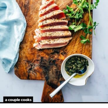 This tuna steak recipe is perfect for pescatarians, tuna fans, or home cooks looking for a quick meal big on fresh, high-quality ingredients. In fact, I love this recipe so much that Alex and I included a rendition of it in our Fancy Foods Show Cookbook, served with this chimichurri sauce!