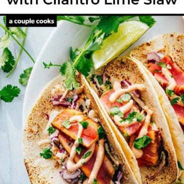 - Assemble the tacos: Add generous spoonfuls of cilantro lime slaw, then slices of tuna. Top with Chipotle Sauce and more fresh cilantro. Enjoy immediately.