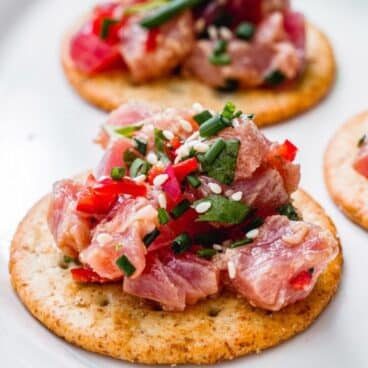 Chef Tachibe’s original recipe for tuna tartare was similar to beef tartare, with French flavors like pickles, onion, capers, tarragon, and a mayonnaise sauce. But over the years, restaurants have taken the concept and made variations on it (as chefs do!). A popular variation is mixing the ahi tuna with Asian-style flavors like soy sauce, rice vinegar, sesame oil, and sesame seeds and served on crackers or toasts. (In fact, it’s very similar to the flavors in ahi poke!)