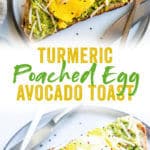 What takes this easy avocado toast beyond the standard? Turmeric poached eggs! What’s a turmeric egg? It’s an egg poached with turmeric stirred into the water. What emerges is a beautiful bright yellow orb that looks infinitely more exciting than a normal poached egg! Making a turmeric eggs only takes a couple minutes, but it’s a lovely addition to anything: avocado toast, a grain bowl, or a big salad. Here’s how to make turmeric eggs: