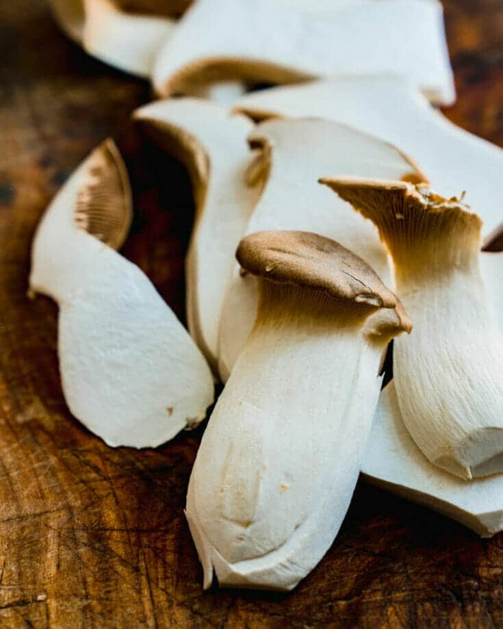 Type: Oyster mushrooms are a common type of edible fungus with caps that are shaped like oysters. The stems are very short and they grow in clusters. There are seven main varieties. The most common types you’ll encounter at the store are pearl oyster mushrooms and King oyster mushrooms (below).