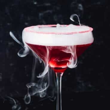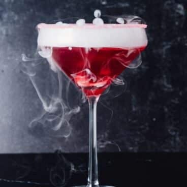 You’ll simply shake up the ingredients, strain it into a cocktail glass, and garnish with a chunk of dry ice! The way that the dry ice makes the smoke wisp into the air is the best party trick.
