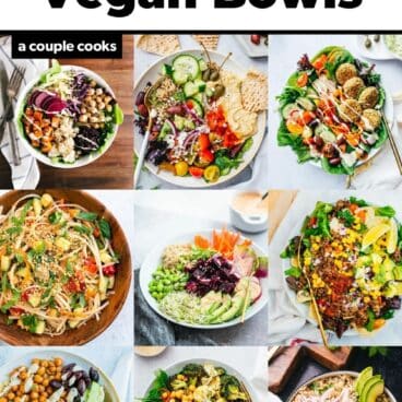 Here’s an irresistible vegan bowl concept: Falafel Salad! Make a batch of this easy baked falafel, then layer them with crunchy veggies and top with a creamy, zingy tahini dressing. Or, use purchased frozen falafel or even repurpose take-out leftovers! This one is a massive hit with our family: and works for weeknights or dinner parties.