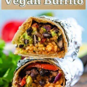 The ultimate vegan burrito! A flavor-packed plant based lunch or dinner idea, it’s stuffed with Mexican rice, seasoned black beans and peppers, and avocado.