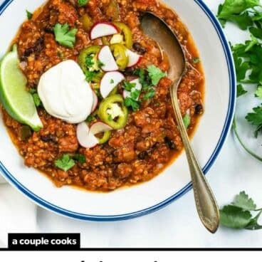 Good question. Alex and I have been making vegan chili recipes for quite a while. Actually, many of the chili recipes on this website are vegan, though they don’t say it! Our Vegetarian Chili is vegan, but we like to top it with cheese. Our Sweet Potato Chili and Mango Black Bean Chili, and even our Quinoa Chili are also vegan. But we wanted to create a Classic BEST EVER Vegan Chili that would outshine them all. And then load it up with all the vegan chili toppings.