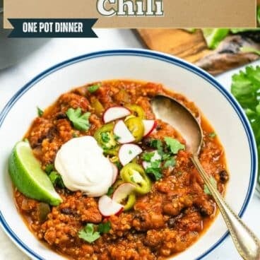 Looking for delicious, filling plant based recipes? This vegan chili is for you. Yep, this one is our best chili recipe yet and it’s totally plant based! Alex and I love finding ways to make vegetables delicious that go over well no matter what your personality or diet choices. And this chili is that: it’s hard to find someone who will turn it down! It’s full of savory flavor starring beans, quinoa, and a hint of adobo sauce for complexity. Top it with our vegan sour cream and some pickled jalapenos and well: it’s out of this world good.