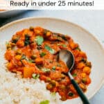 Can you make this quick vegan curry ahead? Yes! To meal prep, you can easily make it 1 day in advance and refrigerate until serving. Then just reheat it gently in a skillet, being sure not to overheat it so that the sauce doesn’t evaporate. Leftovers stay good for about 3 days in the refrigerator.