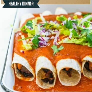 These vegan enchiladas are over the top delicious! Stuffed with black beans and guacamole, they’re doused in a zesty homemade red enchilada sauce.