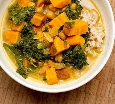 Kale and chickpeas make for a hearty sweet potato stew, while the coconut milk adds just the right amount of smoothness to this cozy and delicious recipe.