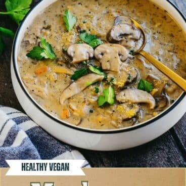This vegan mushroom soup is delightfully creamy and hearty, featuring loads of veggies and hearty whole grains!