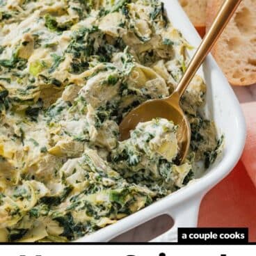 This vegan spinach artichoke dip works well made ahead, and you can pop it in the oven right before entertaining! Make this dip up to 3 days in advance and refrigerate in a sealed container or in a wrapped baking dish. Reheat until warmed through (about 20 to 25 minutes) in a 350F oven before serving. Or, leftovers last 3 days refrigerated.