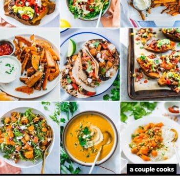 A favorite vegan sweet potato recipe is this Sweet Potato Curry! Tender sweet potatoes and bell peppers swim in a luscious broth of coconut milk and Thai curry paste, topped with fresh cilantro and crunchy peanuts. There’s so much flavor going on, you’ll want to take another bite before you’re finished savoring the first. Welcome to: your easy weeknight dinner soulmate!