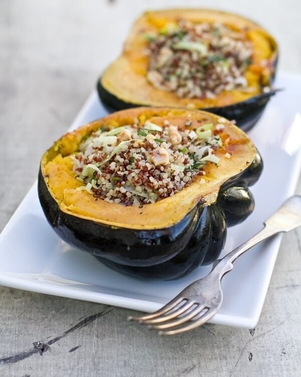 Stuffed squash is the perfect vegan Thanksgiving recipe! This one features tender roasted acorn squash that's stuffed with a hearty quinoa and herb stuffing. It's flecked with leeks, walnuts, fresh sage, and fresh thyme.