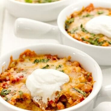 We’ve obviously taken quite a few liberties with these vegetarian tamale pies. Polenta has been used in place of the masa, and we’ve packed the polenta on the bottom of au gratin dishes to act as the crust for this recipe. Store-bought salsa and canned pinto beans cut down on the prep time for this recipe, as does pre-shredded cheese.