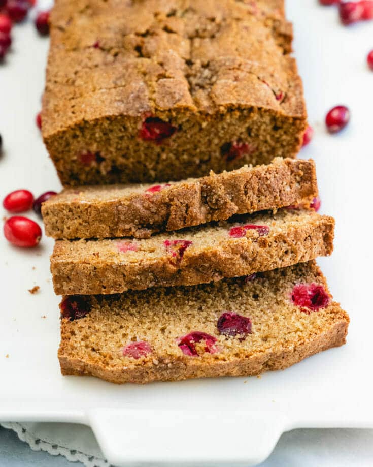 This easy cranberry bread has just the right crunchy outside and fluffy interior. It’s not too sweet, punctuated with tart cranberries. The best part? A hint of vanilla and bourbon seals the deal. There’s a bit of a healthy spin, but it’s every bit a holiday treat! It's perfect as a Christmas appetizer or on a dessert tray.