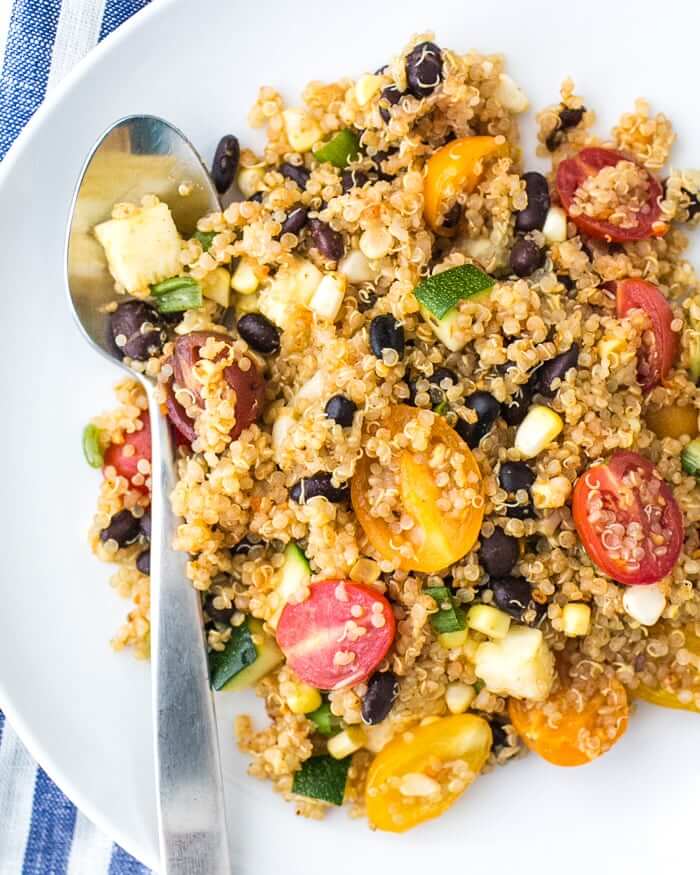 This Mexican quinoa recipe is one of the few vegetarian lunch ideas in this list that requires making the night before. BUT, it’s so delicious and fun that we wanted to add it to the list: and it saves well for lunches throughout the week. Here, quinoa is tossed with black beans, veggies, and fajita seasoning to create a super flavorful and filling salad. It’s one of those lunch recipes that you can’t wait for lunch time so you can dig in! Another option: Caribbean Black Bean Salad