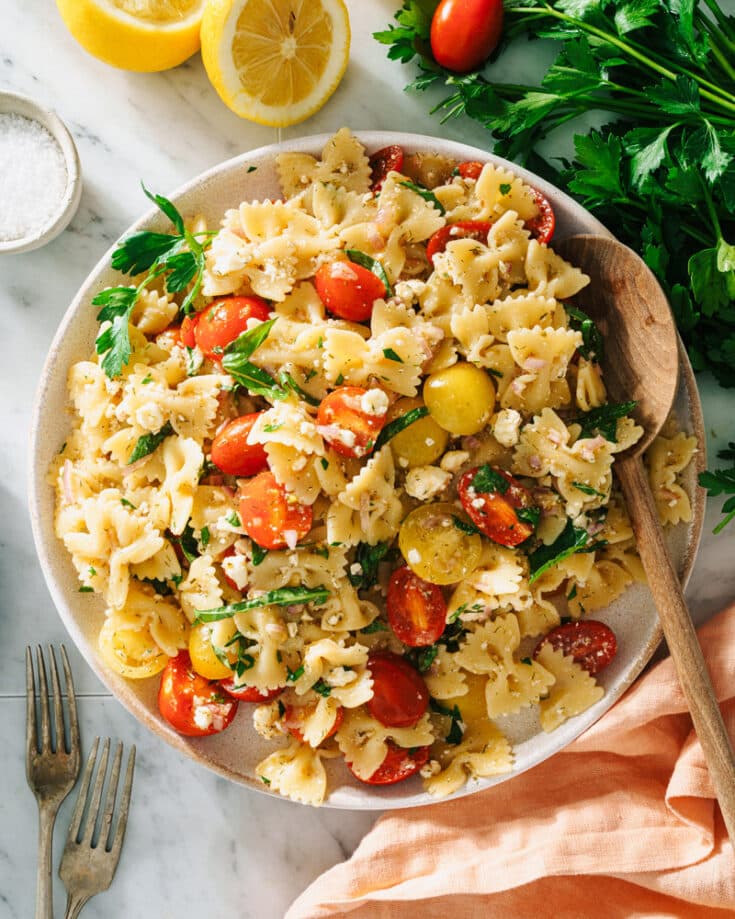 If there’s something we never tire of, it’s a good pasta salad. This easy bow tie pasta salad has become a favorite! Pair the chewy noodles with tomatoes, fresh herbs, and feta cheese, then swirl it with a quick and easy vinaigrette dressing. This one stays good in the refrigerator for days!