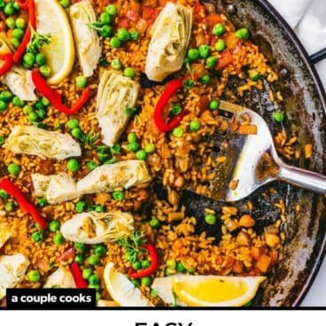 Here’s a recipe that’s guaranteed to get ooo’s and ahh’s whenever you serve it: this classic Vegetarian Paella! Paella is a traditional Spanish dish that has loads of variations. Often it’s made with seafood, but we’ve tasted many delicious vegetable-based versions while traveling in Spain! The saffron-scented rice is loaded with a colorful assortment of vegetables, and it’s a true delight. We love serving it for dinner guests, but if you’re organized this one is easy enough to work for a weeknight. (It’s a vegan paella, too!)