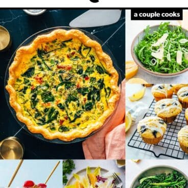For a savory meal, quiche pairs well with baby arugula salad dressed with lemon juice and olive oil, roasted asparagus, or even a French potato salad. If you’re serving at brunch, add blueberry muffins and yogurt parfaits! Here are a few of our favorite sides, plus some of our top quiche recipes for pairing.