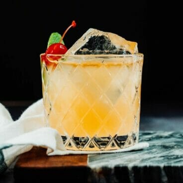 - Strain: Strain it into a glass. If you’d like, add a few dashes of cocktail bitters: they help to make an even more intriguing, nuanced flavor! Garnish with a cherry for the classic look.