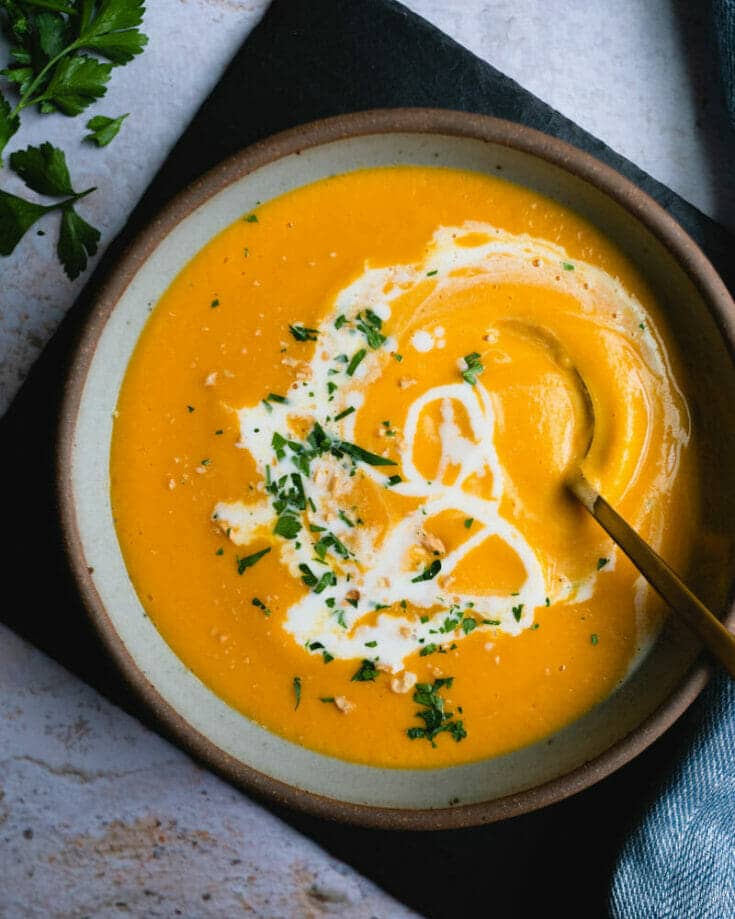Here's a winter lentil soup that's bursting with flavor! It’s full of hearty red lentils and root vegetables, and the broth is swirled with red curry paste and coconut milk. With all the texture and flavor going on, it feels rich and luxurious. But at the same time it’s a healthy, plant based meal!