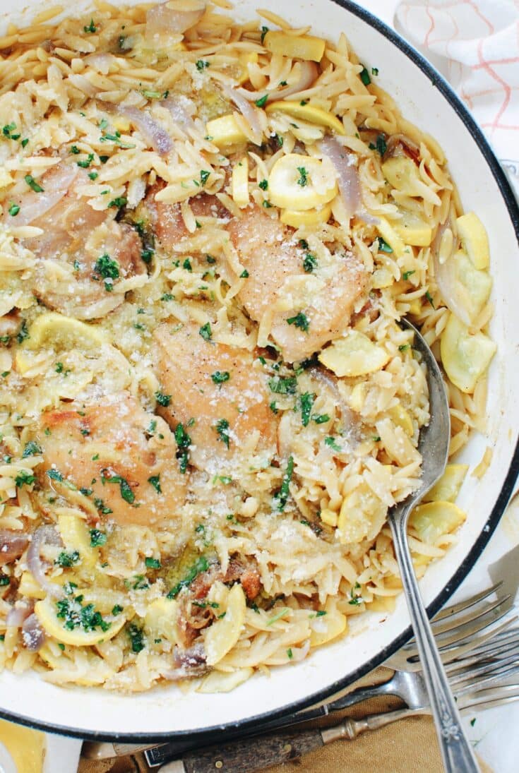 Here's a way to make yellow squash into a one pan meal! Combine it with chicken and orzo, tender herbs and Parmesan cheese, ad it's a deliciously easy dinner. via Bev Cooks