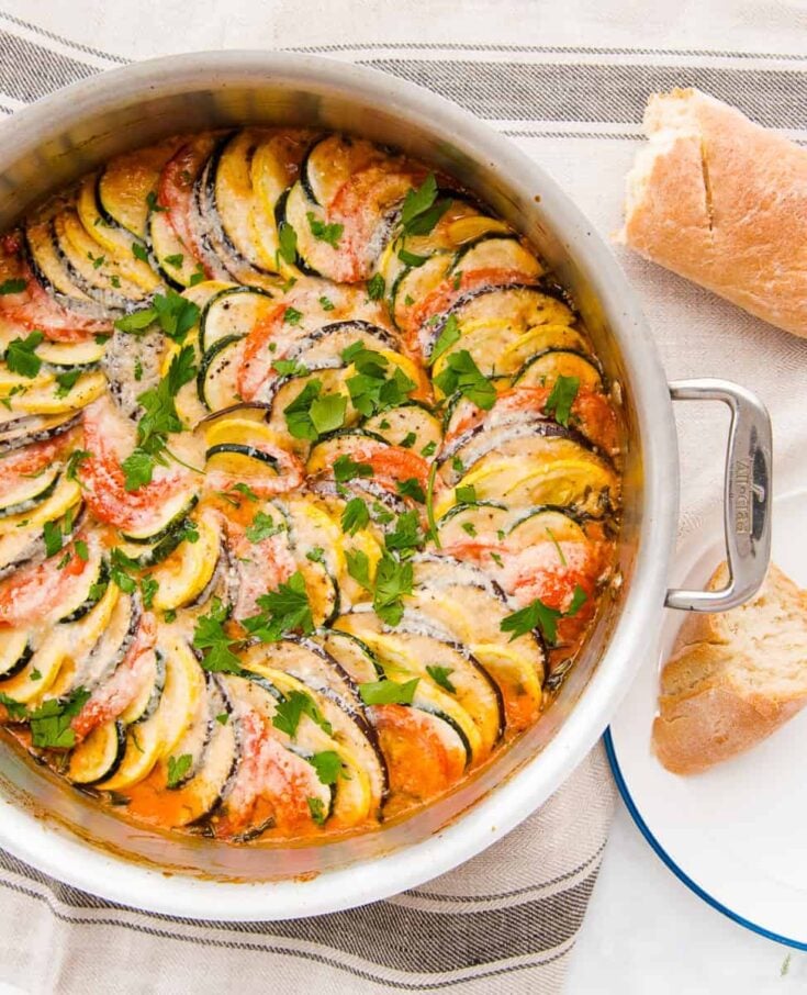 This Italian Ratatouille nestles a combination of summer squashes and tomatoes on a lake of creamy tomato sauce. A liberal amount of Pecorino cheese is added towards the end of baking, then it’s served with a loaf of crusty bread. via Sense and Edibility