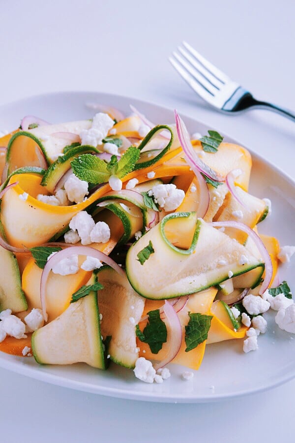 Did you know you can eat yellow squash raw? Try slicing it into thin shavings to put on a salad. Here ribbons of yellow and green squash are tossed with a light lemon vinaigrette, thinly sliced red onion, and topped with crumbled goat cheese and fresh mint. via A Beautiful Plate