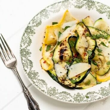 We tried two methods for this zucchini ribbon salad and loved them both, so we’ve shared them both below! The first is a grilled method, which is a little more involved, and of course, requires a grill. The traditional way for zucchini ribbon salad is the raw method – it’s quick, easy, and just as delicious! We were surprised at how flavorful the zucchini was, and we liked the crunchy texture (plus it was a bit easier than firing up the grill).